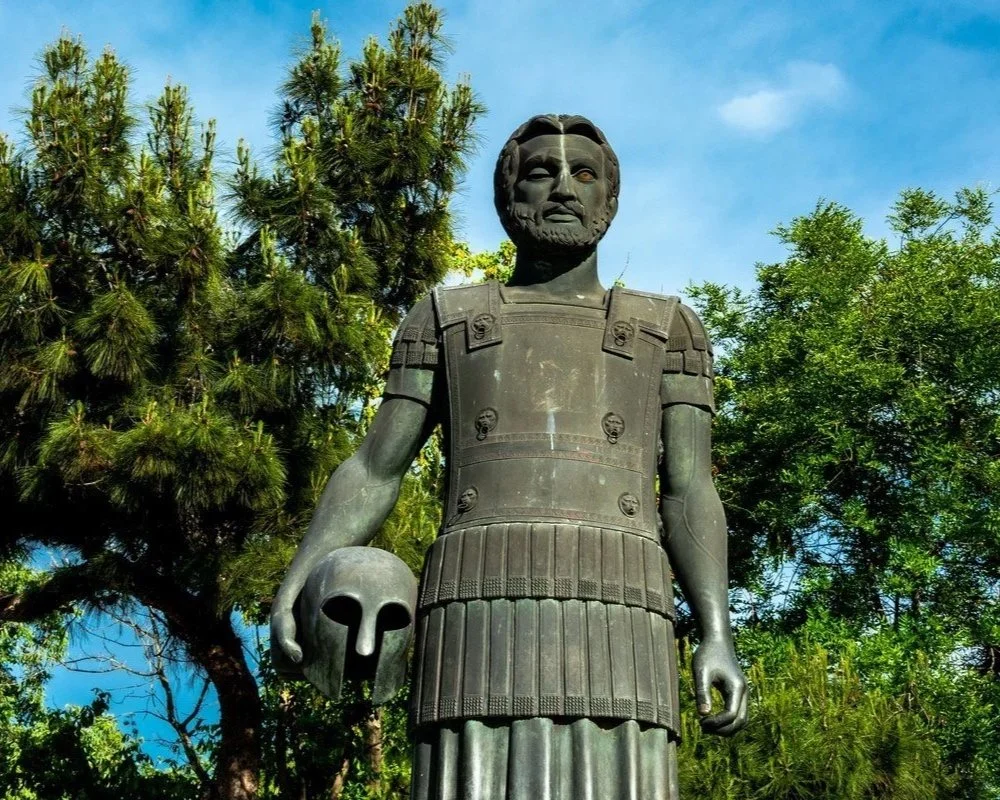 The identity is built around the helmet of King Philip II of Macedon, referencing his statue in Thessaloniki. Its shape subtly echoes a burger, linking heritage with the product.
